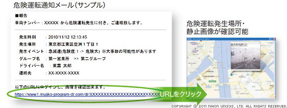 事故や危険運転が発生した際の情報を、速やかにメールで安全運行管理担当者へ通知します。 安全運行管理担当者は、メールに添付された危険運転の静止画により、迅速な対応が可能です。 |